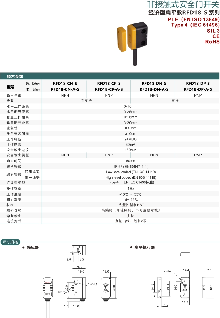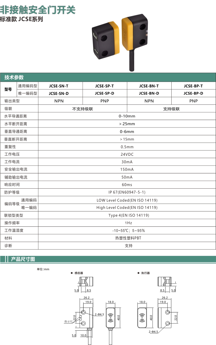 非接触式安全门开关采用无线射频识别应用技术,无论周围发生何种变化,都要安全地进行开关,非接触式安全开关工作稳定可靠。可以根据风险评估和机器设计的要求使用。